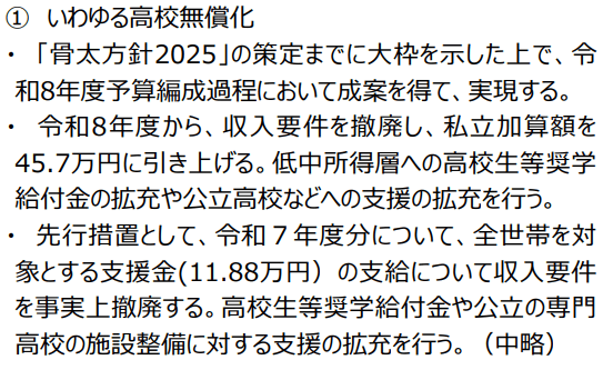 文科省資料「【資料4】いわゆる高校無償化をめぐる動向について」(令和7年7月25日、初等中等教育分科会)のP2(合意抜粋)にこうあります: