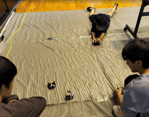たくさんの小学生のみなさんに、ツクガクの生徒たちとロボット相撲に取り組んでいただきました。まさか、地べたに腹ばいになって楽しんでいただけるとは😅