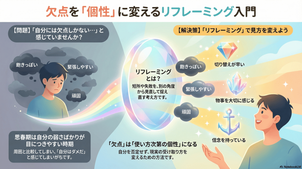 リフレーミング(Reframing)とは、「短所や失敗を、別の角度から見直す考え方」です。
