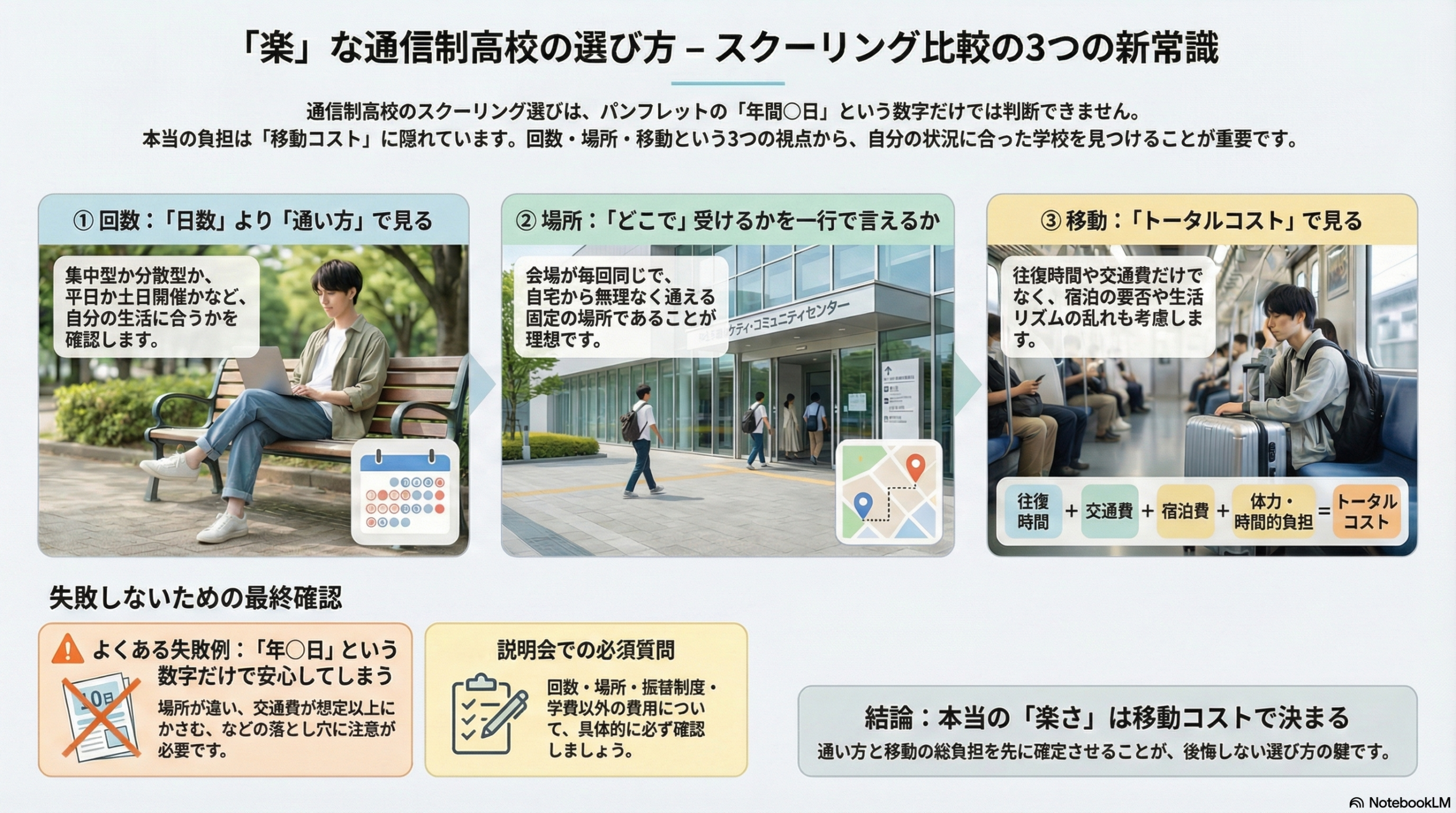 通信制高校を選ぶとき、スクーリング(面接指導)は「あるかないか」ではなく、どれだけ移動の負担が出るかで差が出ます。比較サイトの「年○日」だけでは判断できません。見るべき点は3つです。回数・場所・移動。