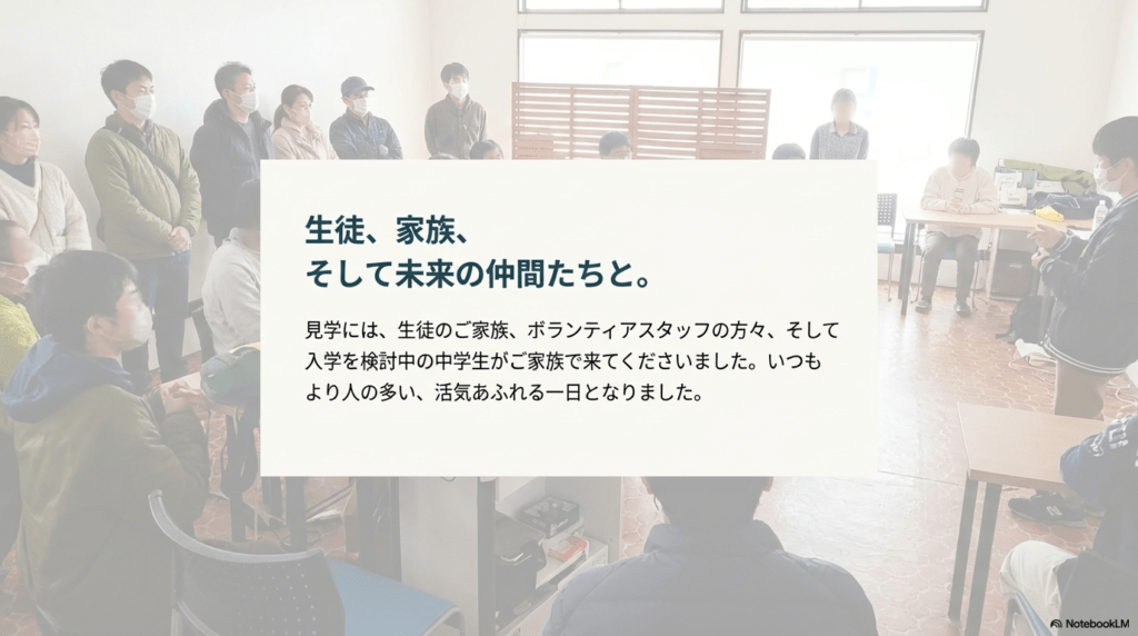 見学には、生徒のご家族やボランティアスタッフの方、そして検討中の中学生がご家族、市議会議員さん、元県議会議委員さんも来てくださいました。