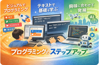 最初から難しい言語に進むのではなく、まずはビジュアル言語で「動く」「変わる」をつかみ、その次にBASICやHSP3のような分かりやすい言語で文字を使ったプログラミングに進み、そこからPython、JavaScript、C系の言語など、興味に合うものへ広げていく形をよく取ります。