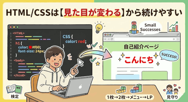 先に結論:HTML/CSSは「見た目が変わる」から続けやすい