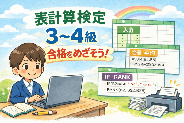 計算が苦手だと、内容は分かっていても「手が止まる」場面が出ることがあります。そこで大切なのは、先に“進め方の型”を作って、取り掛かりのきっかけを用意することです。表計算検定(日本情報処理検定協会)の3〜4級は出題範囲が決まっているため、その型を作って練習しやすいのが特徴です。この記事では、3〜4級で必要になる操作を先に絞り、合格につなげる手順をまとめます。